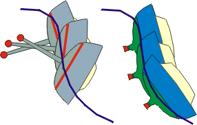 | Może być też inaczej. Zwróćmy uwagę na prądy powierzchniowe fali. Przy wolnym płynięciu szybkość i kierunek prądu grzbietu fali jest zgodny z kierunkiem płynięcia. Skuteczność działania steru znikoma. Jacht może zostać ustawiony równolegle do fali i znaleźć się w sytuacji przedstawionej na Rys.10. Burta zawietrzna, wtłaczana jest w wodę i hamowana w stosunku do nawietrznej. Mechanizm wywrotki przez burtę spowodowanej przez załamującą się falę przedstawiony na Rys.10. jest częściej spotykany. Fala nie musi być wypiętrzona do tak monstrualnych rozmiarów jak przy koziołkowaniu przez dziób. |